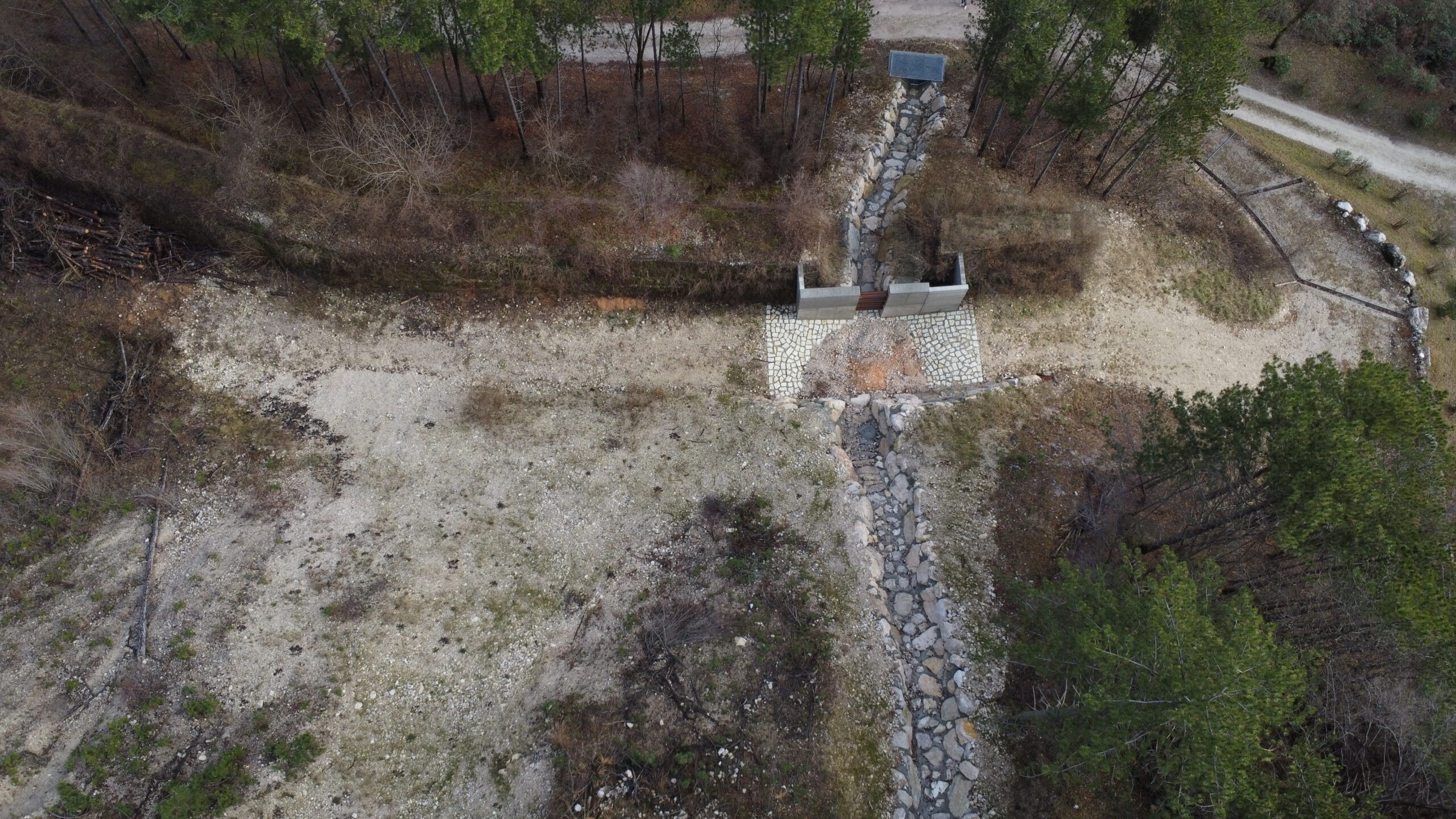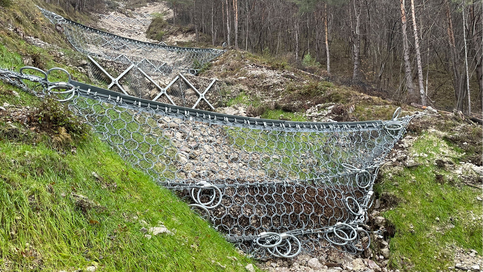 Progetto definitivo, esecutivo e direzione lavori. Il progetto prevede l’installazione combinata di elementi di protezione e consolidamento attivi e passivi, il collettamento delle acque di versante mediante un cunettone verso un’opera da presa costituita da una briglia selettiva e il successivo convogliamento delle acque prive di materiali detritici verso due vasche per l’infiltrazione profonda per la dispersione del volume liquido.